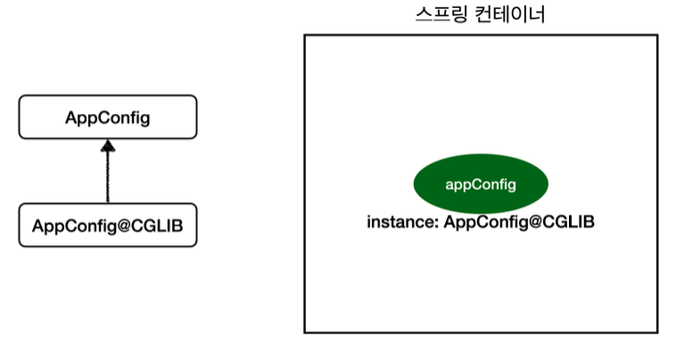 스프링 컨테이너는 싱글톤 방식을 보장해주어야 하기 때문에 CGLIB라는 바이트코드 조작 라이브러리를 사용해서 AppConfig를 상속받은 다른 클래스를 만들고, 그 다른 클래스를 스프링 빈으로 등록한다.