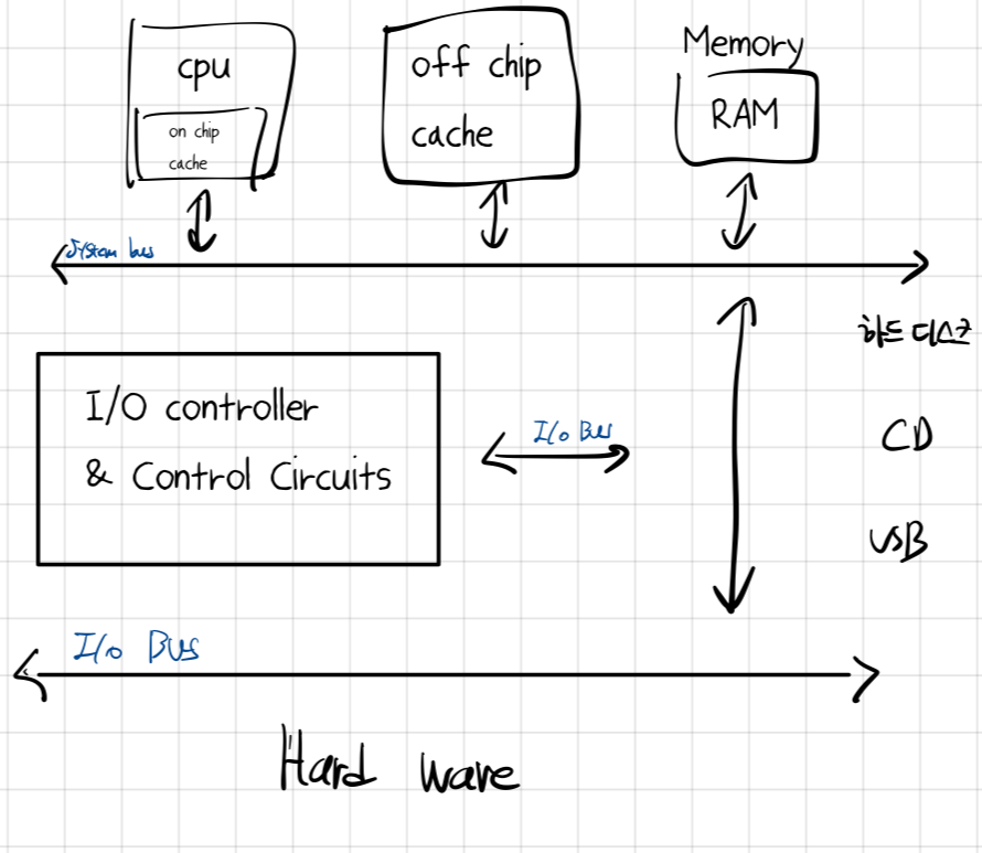 또 목적에 따라서는 SystemBus와 I/O Bus로 나눌 수 있는데, SystemBus는 빠른 하드웨어(CPU,RAM,Cache)를 위한 것이며 I/O Bus는 더 느린 하드웨어를 위한 것이다. 만약 모든 하드웨어가 같은 버스를 사용한다면 느린 하드웨어 때문에 효율성이 떠러지게 될 것이다.