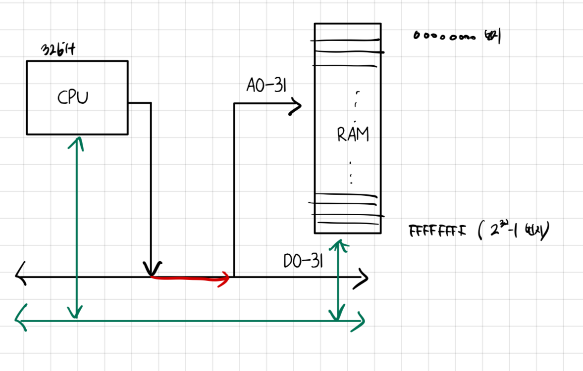 CPU는 32개의 주소선(A0-31)을 이용해서 RAM과 상호작용한다. RAM에 직접적으로 연결되는 것이 아닌 주소버스(검정선)를 통해서 RAM에 연결하고, 데이터 버스(초록선)를 통해서 데이터를 전달 받는다.