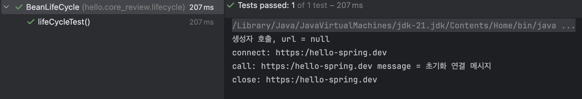 - 싱글톤 빈들은 스프링 컨테이너가 종료될 대 싱글톤 빈들도 함께 종료되기 때문에 스프링 컨테이너가 종료되기 직전, 소멸전 콜백이 일어난다.