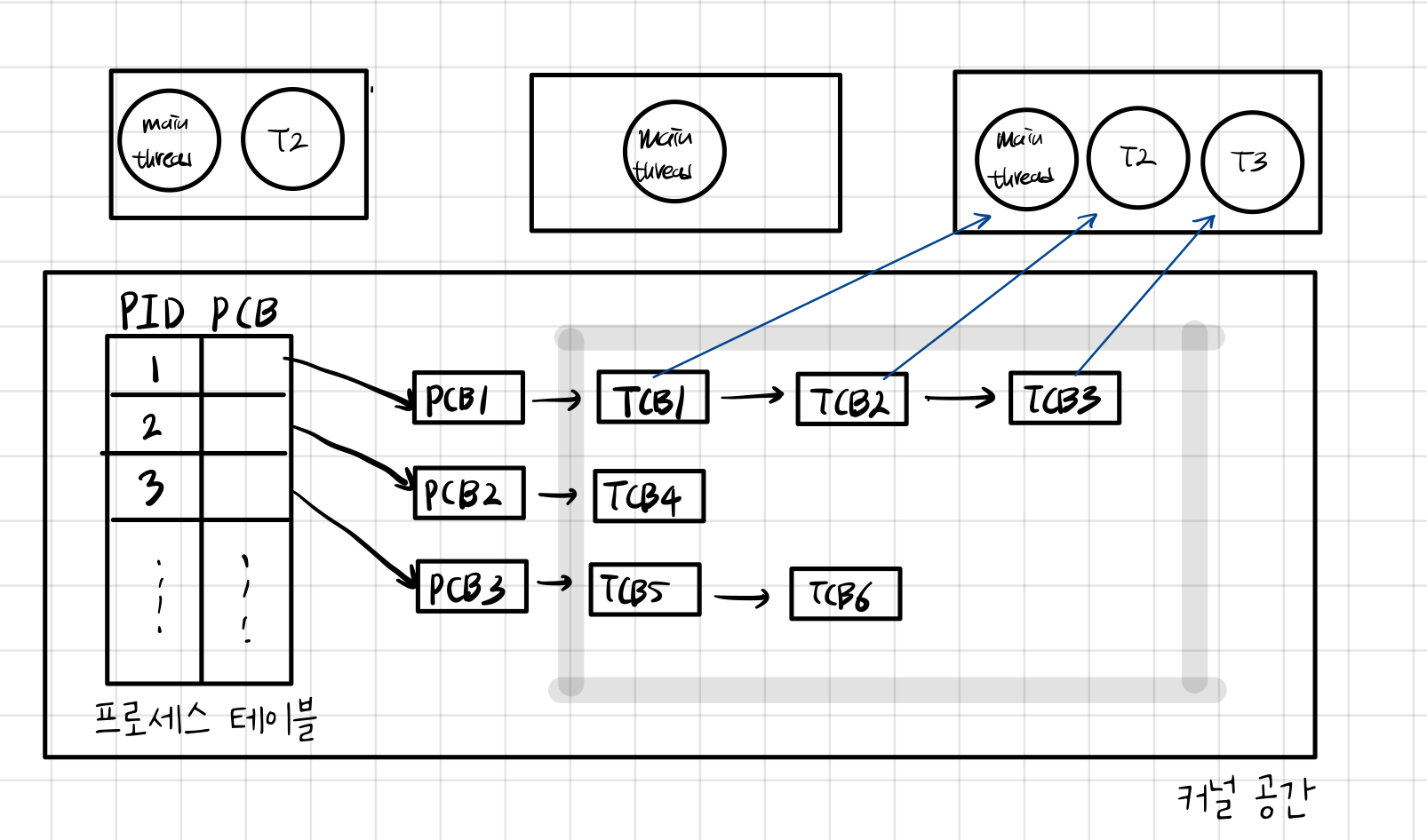 PCB마다 최소 하나의 TCB를 가지고 있으며, 이것이 main thread 이다. 그리고 main thread가 t2, t3 ..등등 추가적인 스레드를 만들언낸다.