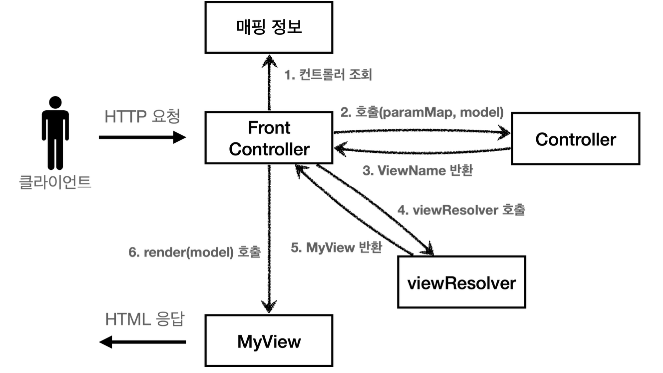 Controller가 ModelView를 반환하지 않고 바로 ViewName을 반환해서 이를 ViewResolver를 통해 실제 주소로 변환시키고 랜더링을 통해 뷰를 호출하게 했다. Front Controller에서 Controller를 호출할 때 모델 자체를 파라미터로 전달해 더 사용하기 편리하게 만든 것이다.