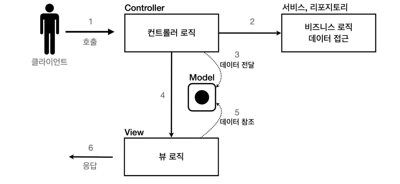- HTTP 요청을 받아서 파라미터를 검증하고, 비즈니스 로직을 실행한다. 그리고 뷰에 전달할 결과 데이터를 조회해서 모델에 담아두는 역할을 한다. 즉 HTTP 요청을 받고 파라미터를 검증한 다음 비즈니스 로직 실행 후에 모델에 데이터를 전달하는 역할을 하는 것이다.
