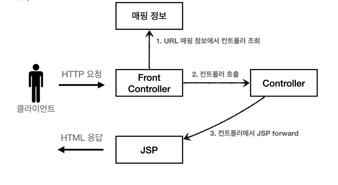 Front Controller는 HTTP 요청을 가장 먼저 받아서 요청에 맞는 컨트롤러를 매핑 정보를 통해 호출해준다. 그리고 호출된 컨트롤러는 JSP를 호출하고 HTML 형태로 응답한다.