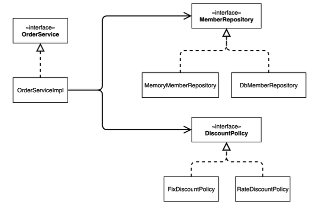 OrderServiceImpl은 MemberRepository와 DiscountPolicy에 의존하고 있다.