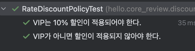 고객이 VIP 고객일 때와 VIP 고객이 아닐 때를 나누어서 테스트 해보았다. @DisplayName 어노태이션은 Test를 돌렸을 때 테스트 이름을 표시해주는 것이다.